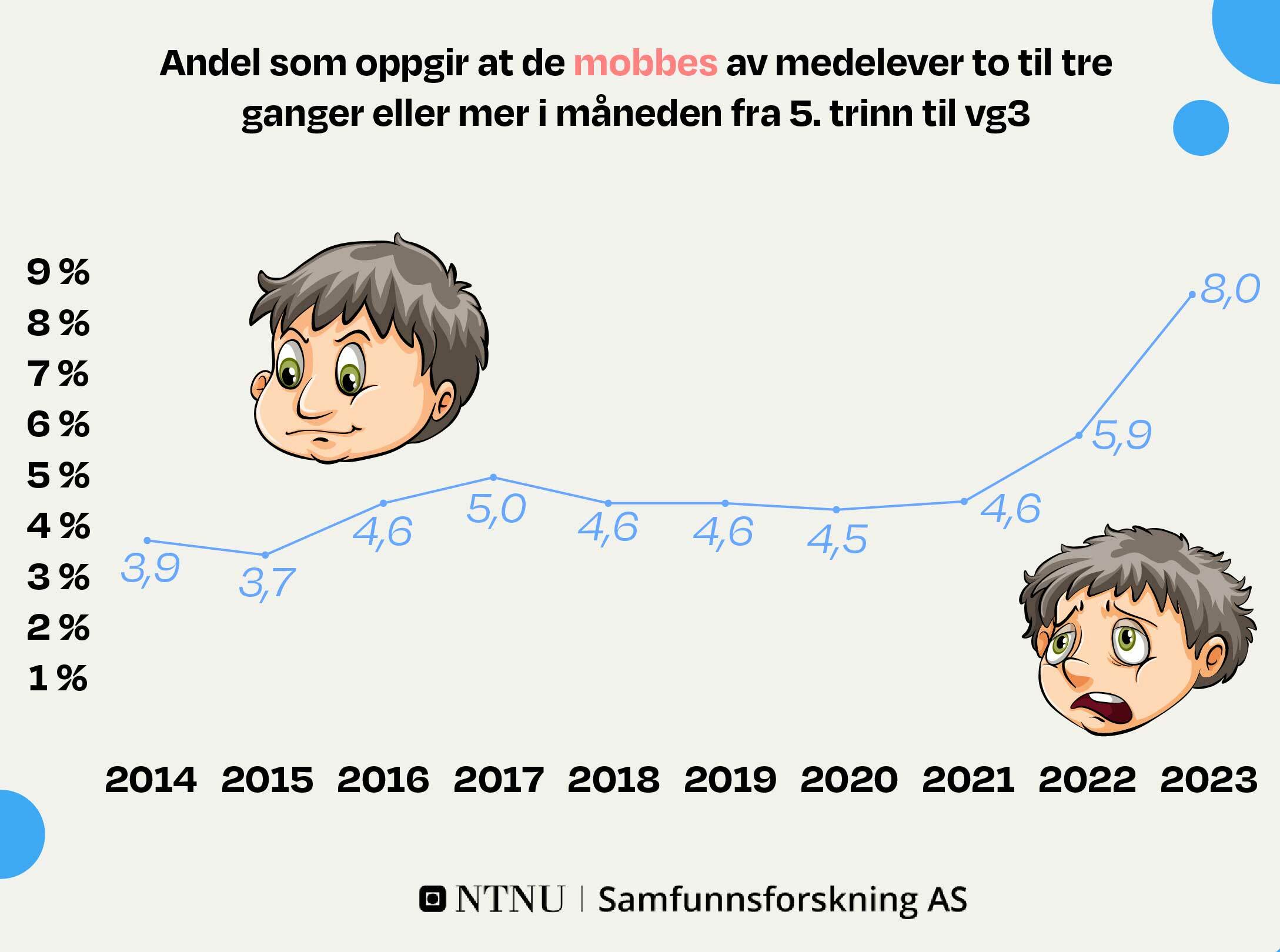 Det vil si at det er en økning på over 4 prosentpoeng fra 2021 til 2023 i andel elever som utsettes for mobbing.